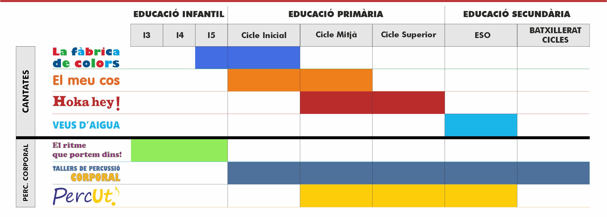 El conjunt de les nostres Cantates, Espectacles participatius i Tallers cobreixen tots els nivells des d’EDUCACIÓ INFANTIL i tot PRIMÀRIA fins a ESO, CICLES i BATXILLERAT, per tal d’oferir-vos un programa continu de formació i vivència musical per als vostres alumnes, a qualsevol edat. Tots ells són projectes de participació activa en què els alumnes són els protagonistes i agents de l’acció musical.